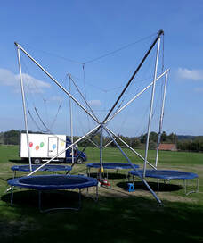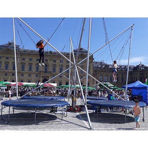 Diese Anlage ist der Hingucker auf jeder Veranstaltung. An 4 Sprungplätzen können sich Springer ab 3 – 99 Jahren austoben und ausprobieren. Gesichert durch spezielle Gummiseile erreichen auch ungeübte Springer schnell eine Höhe von 5-8 Metern. Selbstverständlich sind bei solchen Anlagen Salto oder Doppel- und Dreifachsaltis möglich.