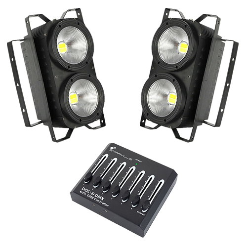 Set: 2x Blinder/Strobo Blitzlicht, DMX Mischpult 6 Kanal, Kabel und Aufhängevorrichtungen